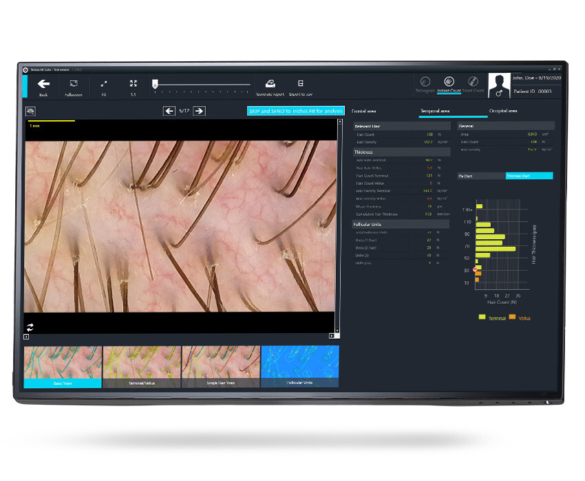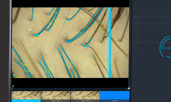 - Računalniška analiza: Program TrichoLAB primerja podatke z referenčnimi vrednostmi in analizira gostoto, debelino, število lasnih foliklov.